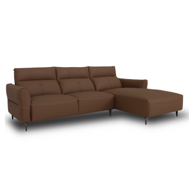 A sleek L-shaped sofa in half leather with adjustable headrests. Right side chaise