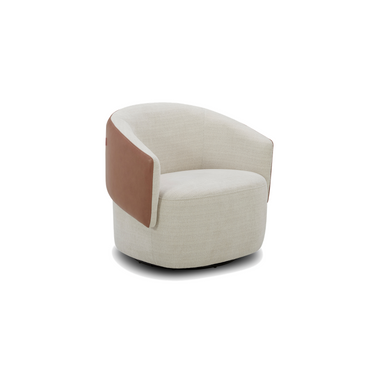 A contemporary tub style accent chair with a metal swivel base. Features 2-tone upholstery in fabric and leather.