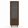 A mid-century display cabinet featuring one glass door, three shelves, two drawers with rubberwood legs.
