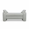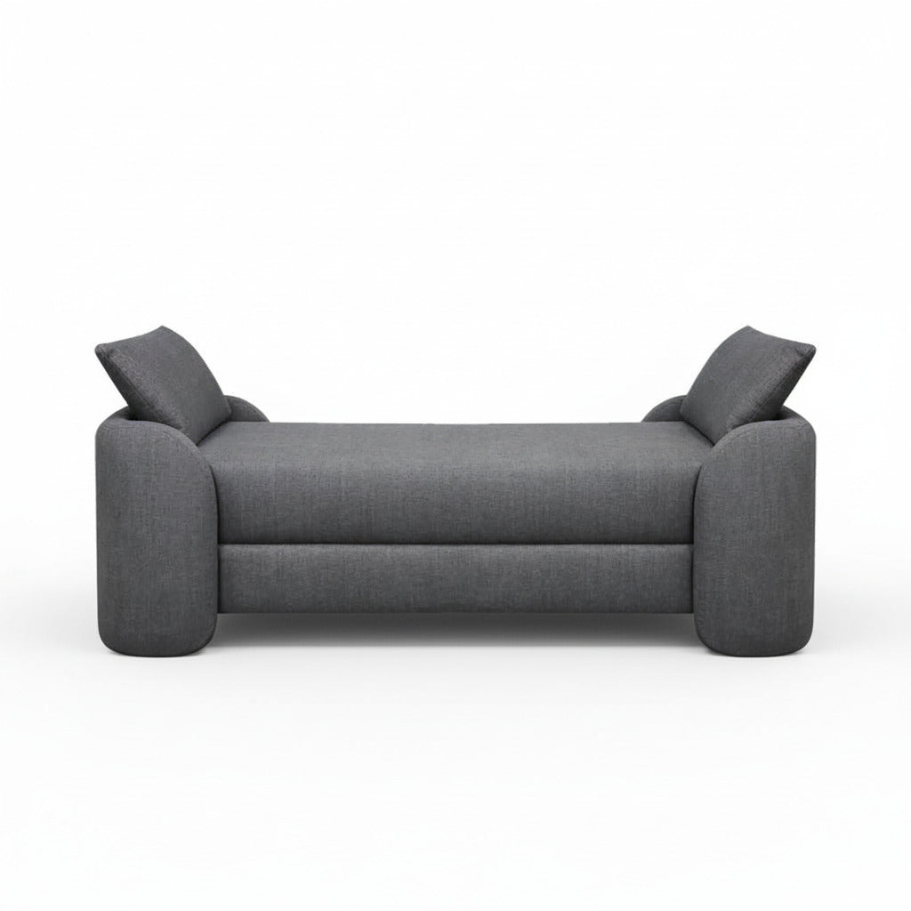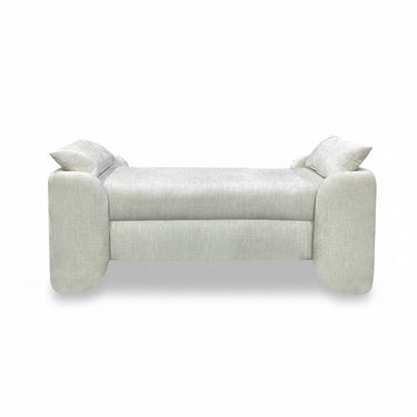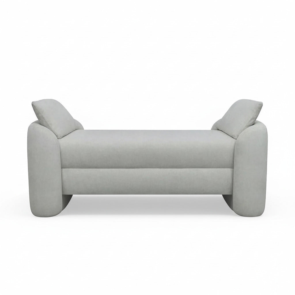 A modern luxe rectangular bench upholstered in fabric featuring a curved silhouette and two side cushions.