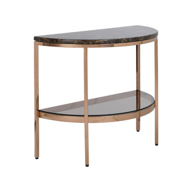A modern half circle style side table table top made from the natural stone finished with glossy brown marble pattern. With glass bottom shelf on rose gold stainless frame.