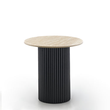 An oval shape resin on stone table in travertine finish on a black fluted base. Heat and scratch resistant.