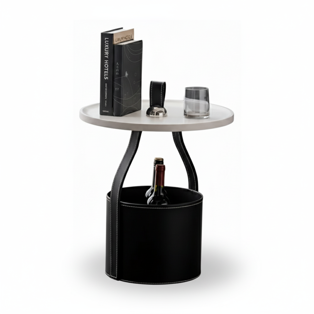 A compact round side table featuring a saddle leather wrapped base with a built-in storage compartment and a handle on top.