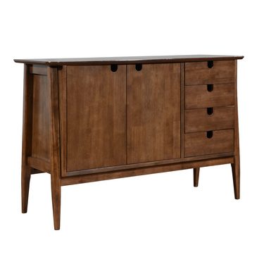 A two-door sideboard with four full-extension drawers, shelves, and an integrated handles.