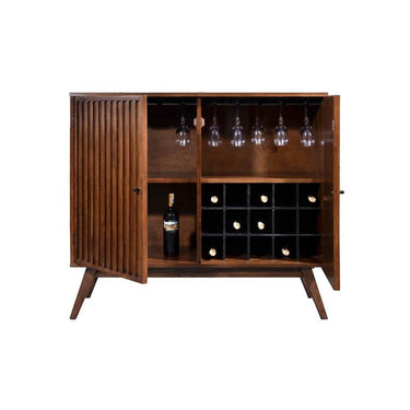 A two door bar cabinet in slatted design with twelve bottle wine rack & hanging racks for glassware. One fixed shelf with metal handle.