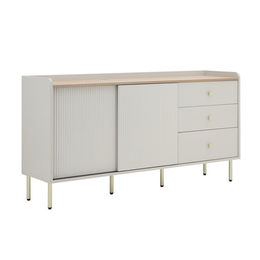 A modern sideboard featuring two fluted design sliding doors and three drawers with gold finish steel legs and handles.