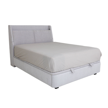 A Fabric upholstered multi-function bedframe with a Lift-up storage base. Two headboard storage compartments, top shelf, two LED dimmable lights, and a USB-C port in the headboard.