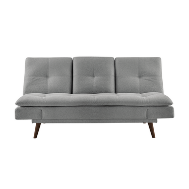 A modern sofa bed with a pillow top and adjustable armrests. Features a drop-down backrest with 2 cup holders. A fabric upholstered with tapered wooden legs in walnut finish.