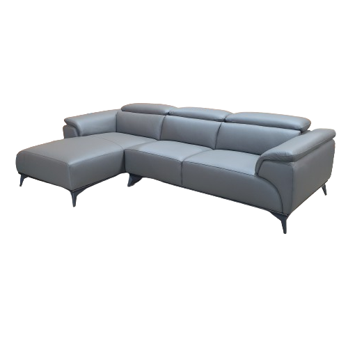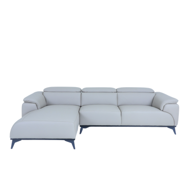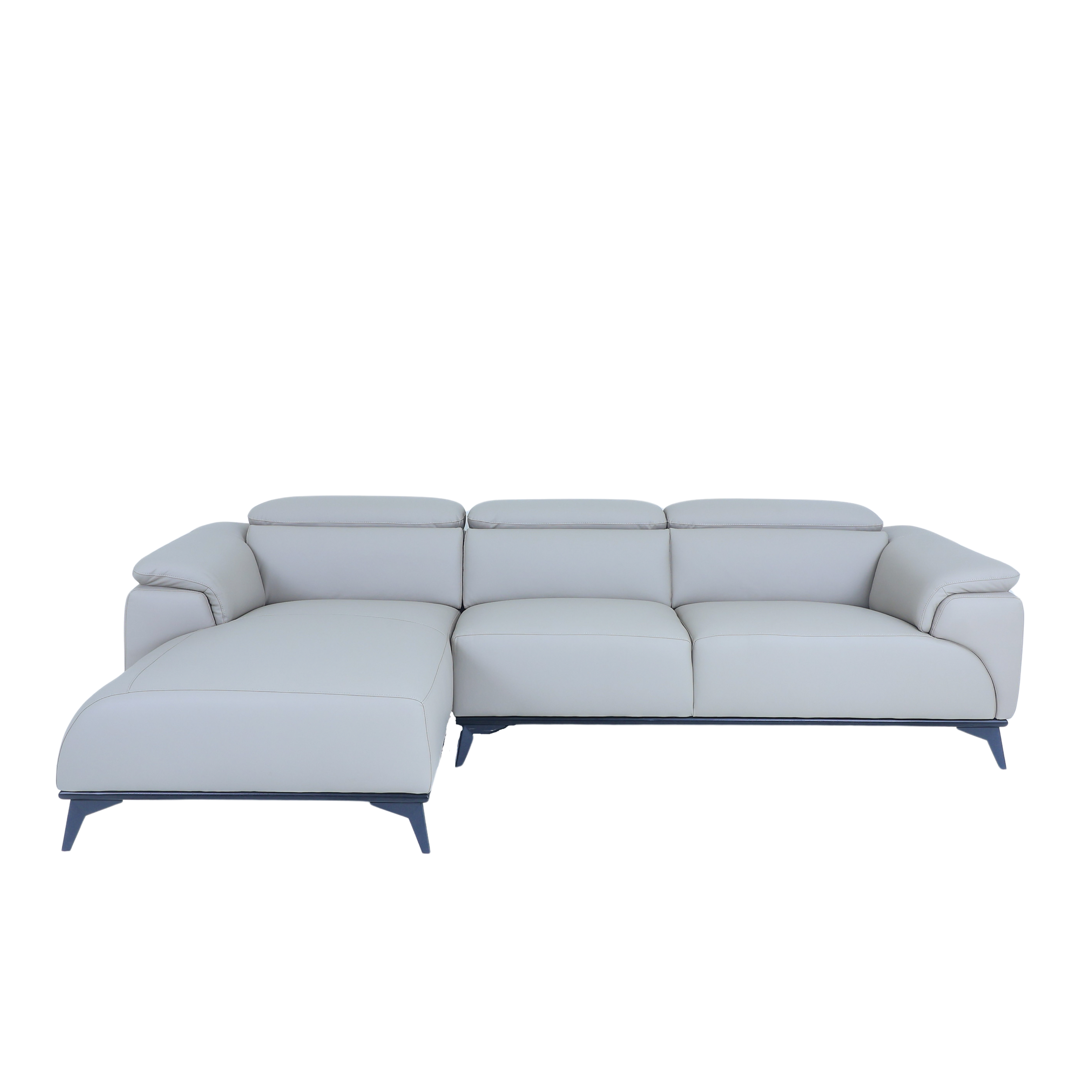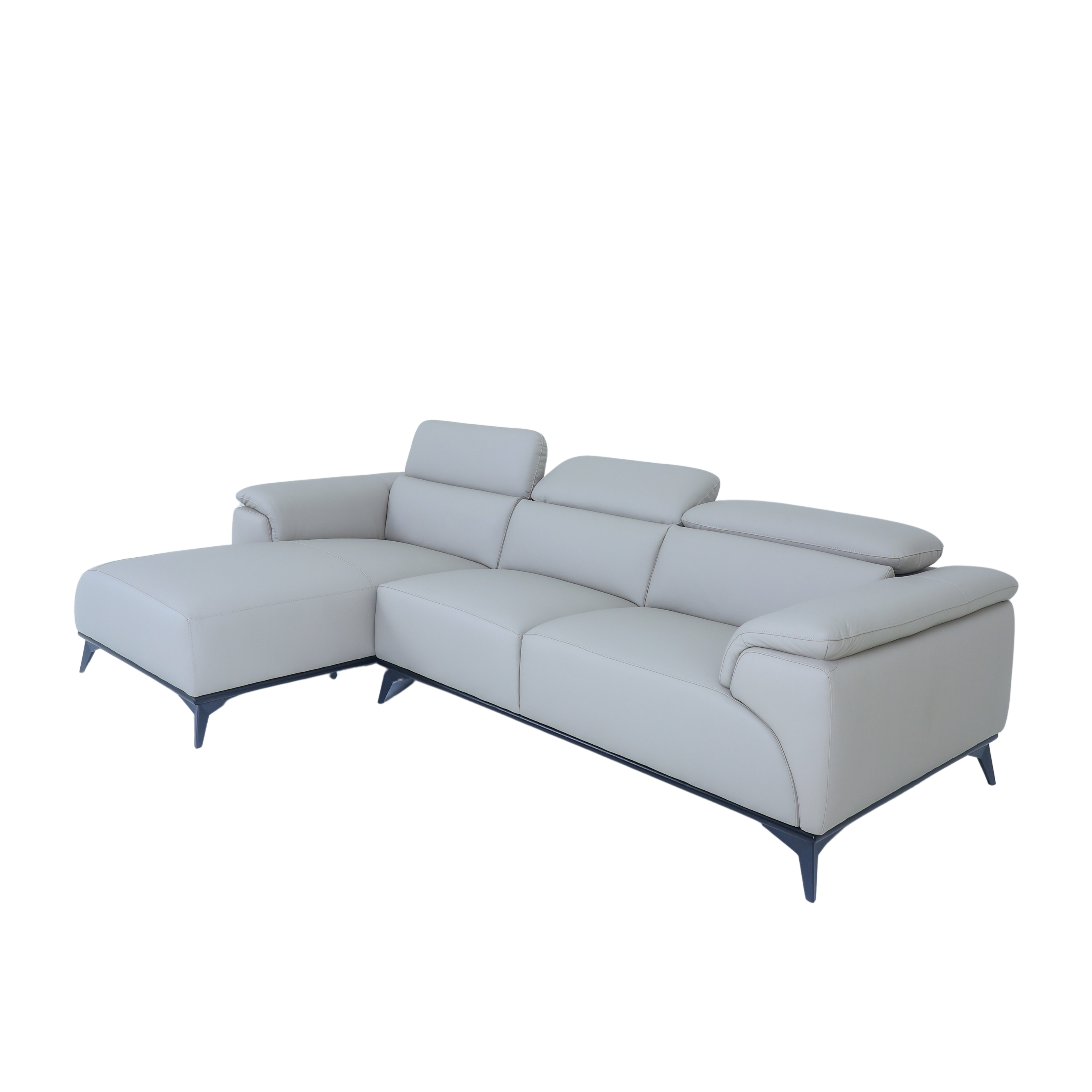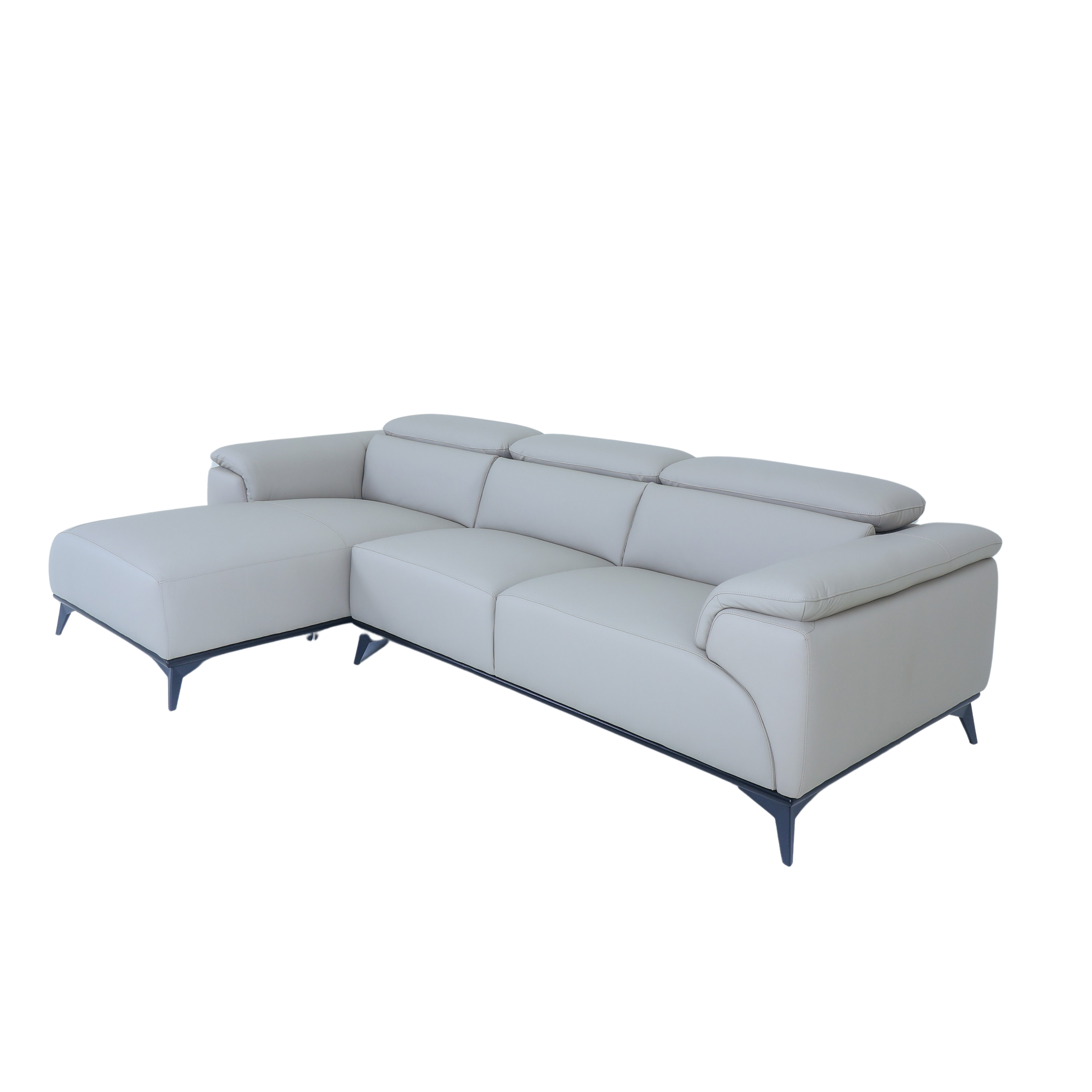 Modern L-shape sofa with adjustable headrest on rubberwood accent base and black powder coated metal legs. Left side chaise. Half leather