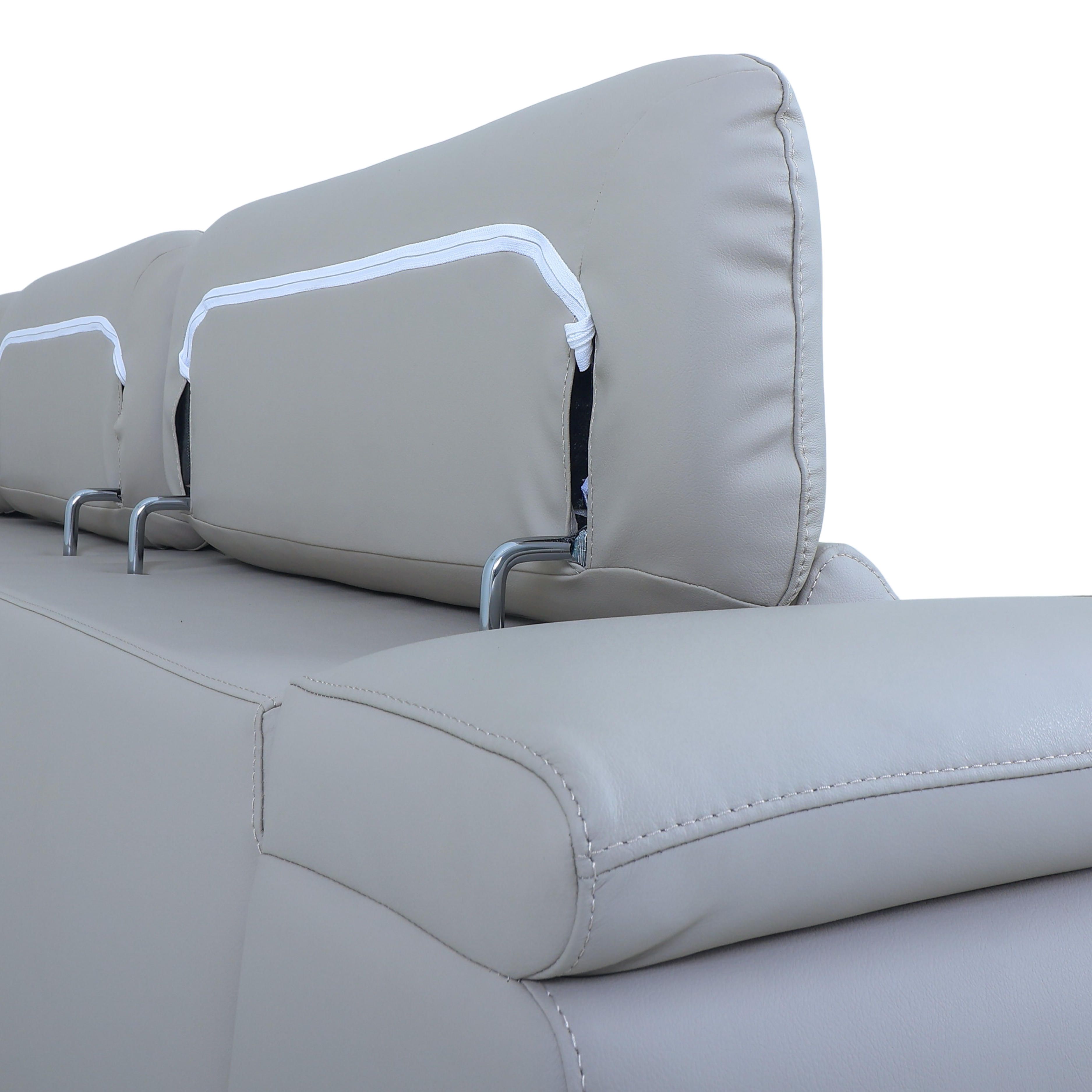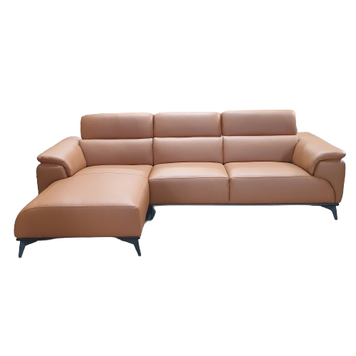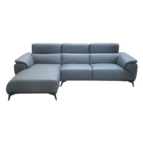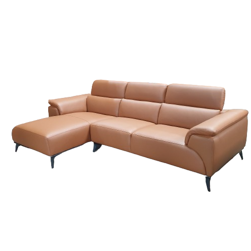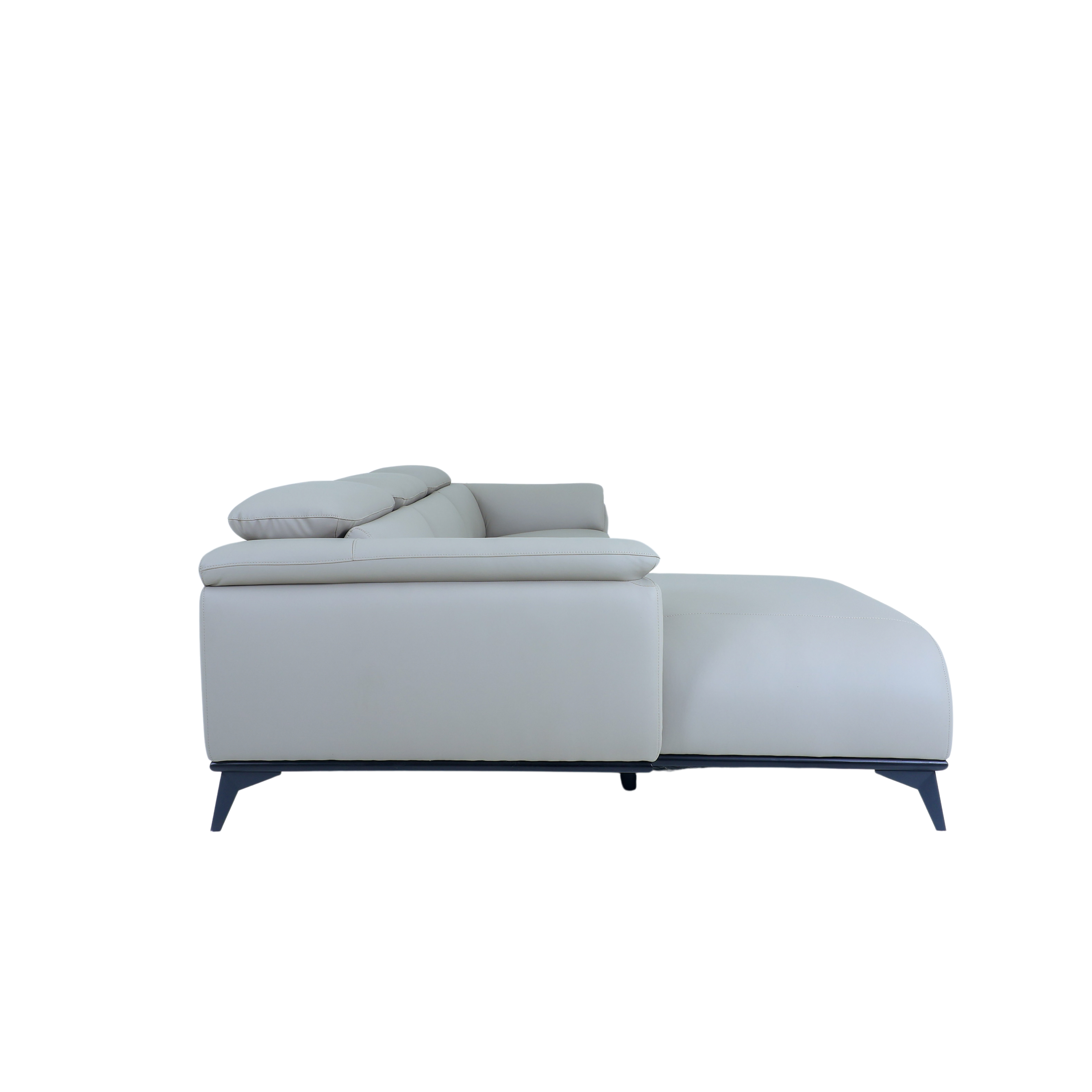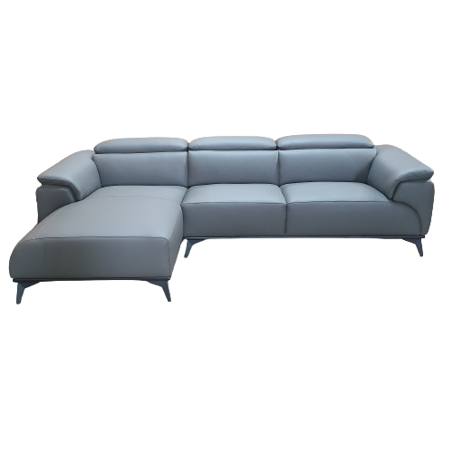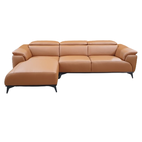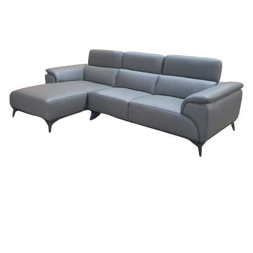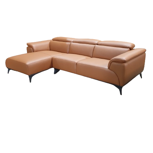 Modern L-shape sofa with adjustable headrest on rubberwood accent base and black powder coated metal legs. Left side chaise. Half leather