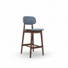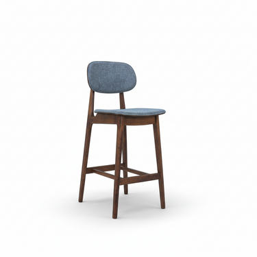 A bentwood barstool with fabric upholstered seat and back.