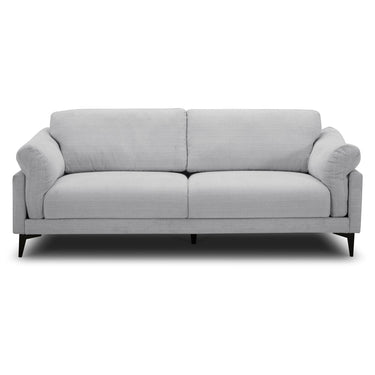 A contemporary luxe fabric sofa featuring flared cushioned armrest and comfort.