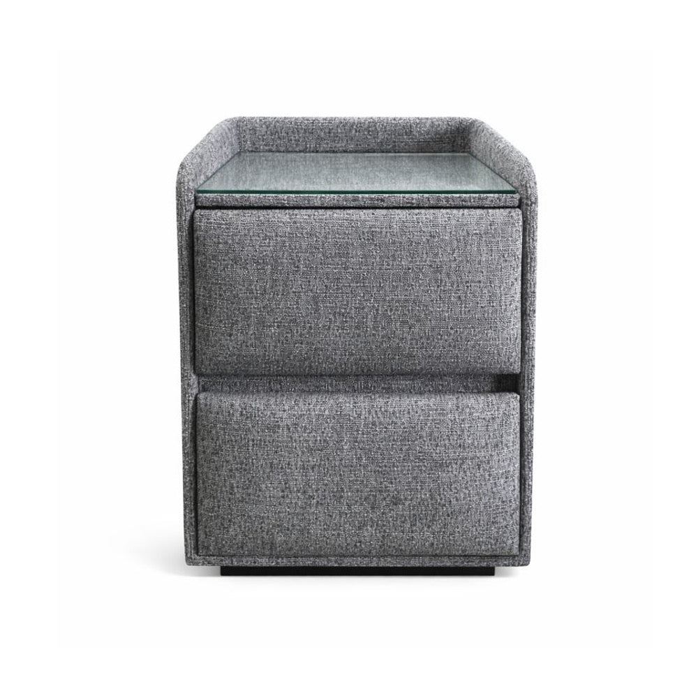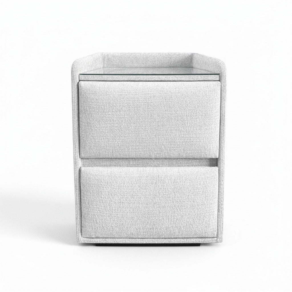 Its streamlined look is complemented by two handle-less drawers, offering ample storage for bedside essentials while maintaining a seamless aesthetic. The tempered glass top provides a durable and sophisticated surface for your morning coffee or evening read.