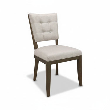 Elegant upholstered dining chair with button tufted backrest. Solid wood frame.