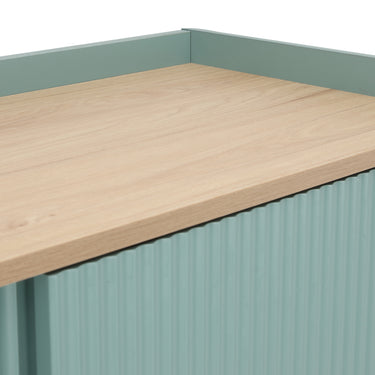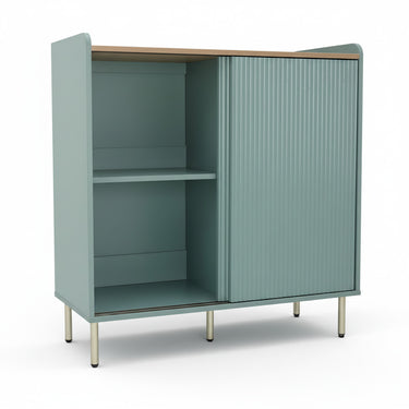 A modern low cabinet featuring two fluted design sliding doors and adjustable shelves with gold finish steel legs. Wall mounting recommended.