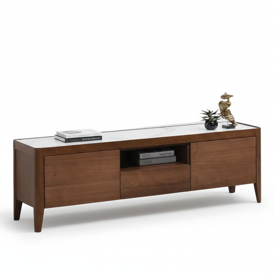 A modern luxe wooden TV unit with white sintered top and a walnut veneer. Features an elegant beveled edge. Two door cabinet, one drawer and one open compartment on slim wooden legs.